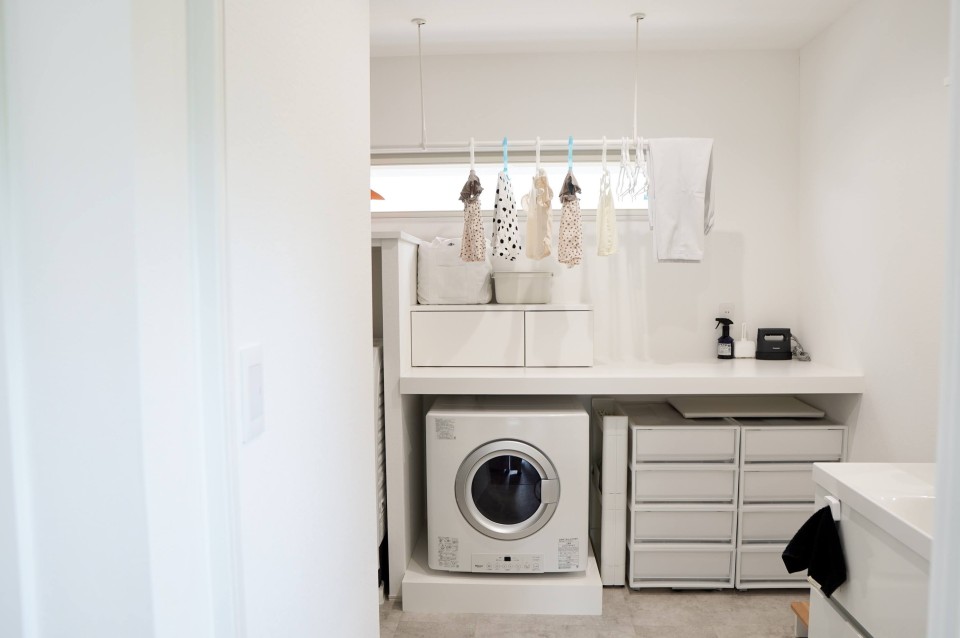 ユニテハウスが提案する「機能的な箱の家」では、水回りを1箇所に集約し、脱衣所から数歩で干せる「ゼロ動線」もご提案しています。