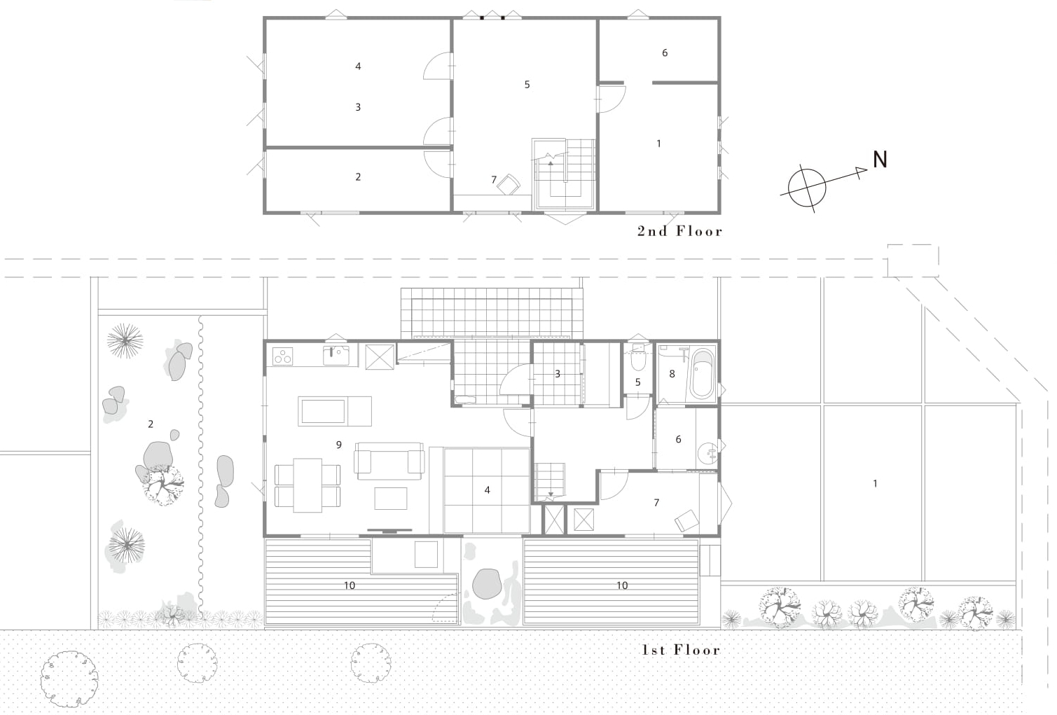 1st Floor / 1.Parking space 2.Garden 3.Entrance 4.Tatami Corner 5.Toilet 6.Sanitary room 7.Utility 8.Bath room 9.L.D.K(22.3帖) 10.Wood deck