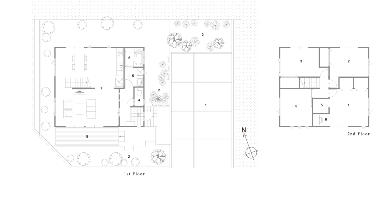 1st Floor / 1.Parking space 2.Garden 3.Entrance 4.Toilet 5.Sanitary room6.Bath room 7.L.D.K(12.5帖) 8.Wood deck