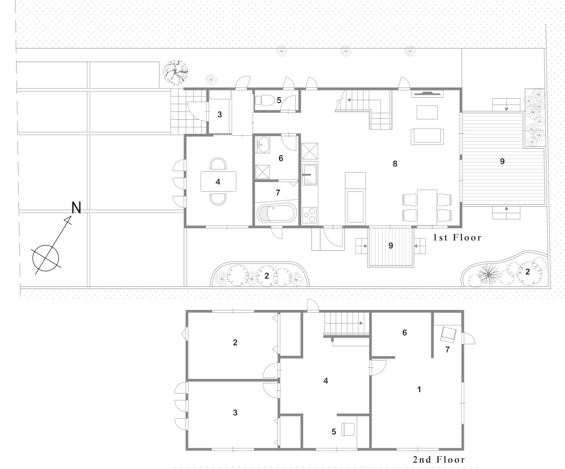 1st Floor / 1.Parking space 2.Garden 3.Entrance 4.Room1(6.0帖) 5.Toilet 6.Sanitary Room 7.Bath room 8.L.D.K(21.0帖) 9.Wood deck