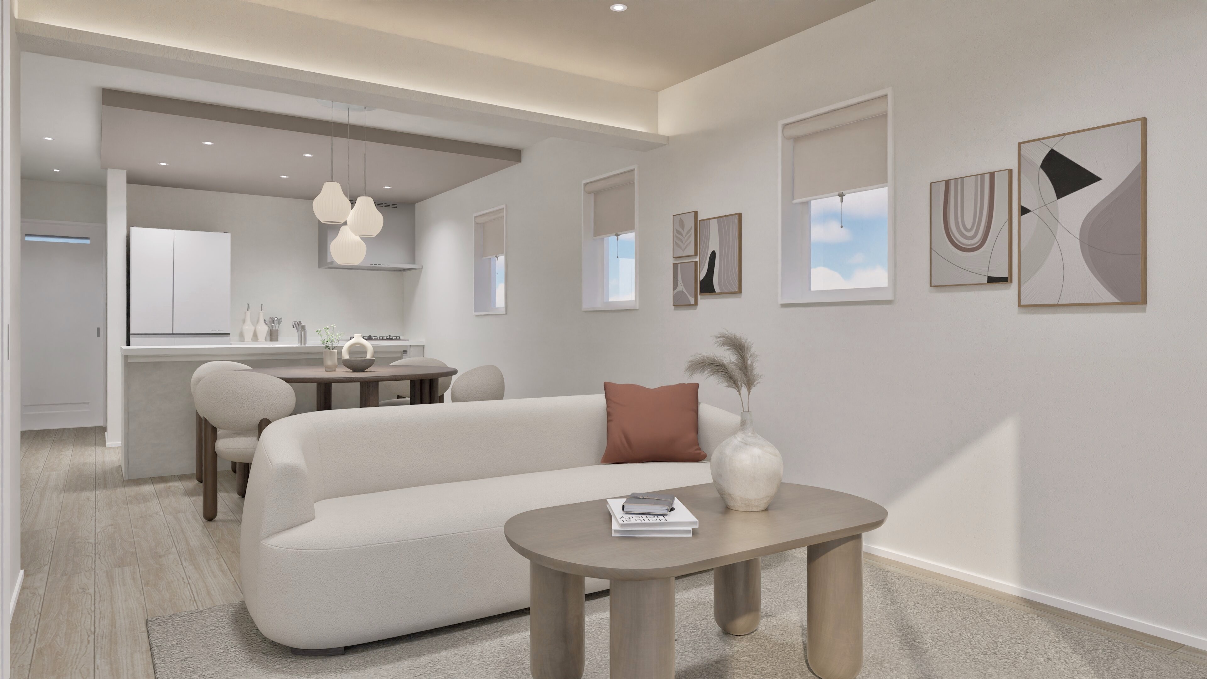 淡いトーンと柔らかなフォルムで構成された「ソフトミニマル」は、生活感を程よく抑えつつも、どこか温かみを感じさせる洗練されたスタイルです。ミニマルな美しさをベースに、ブークレやラタンといった自然な風合いの素材を組み合わせることで、空間に優しさと奥行きを与えます。漆喰風のマットクロスが光を柔らかく反射し、日々の喧騒を忘れさせてくれる穏やかな時間を演出。シンプルでありながら、心から安らげる住まいを求める方に最適です。