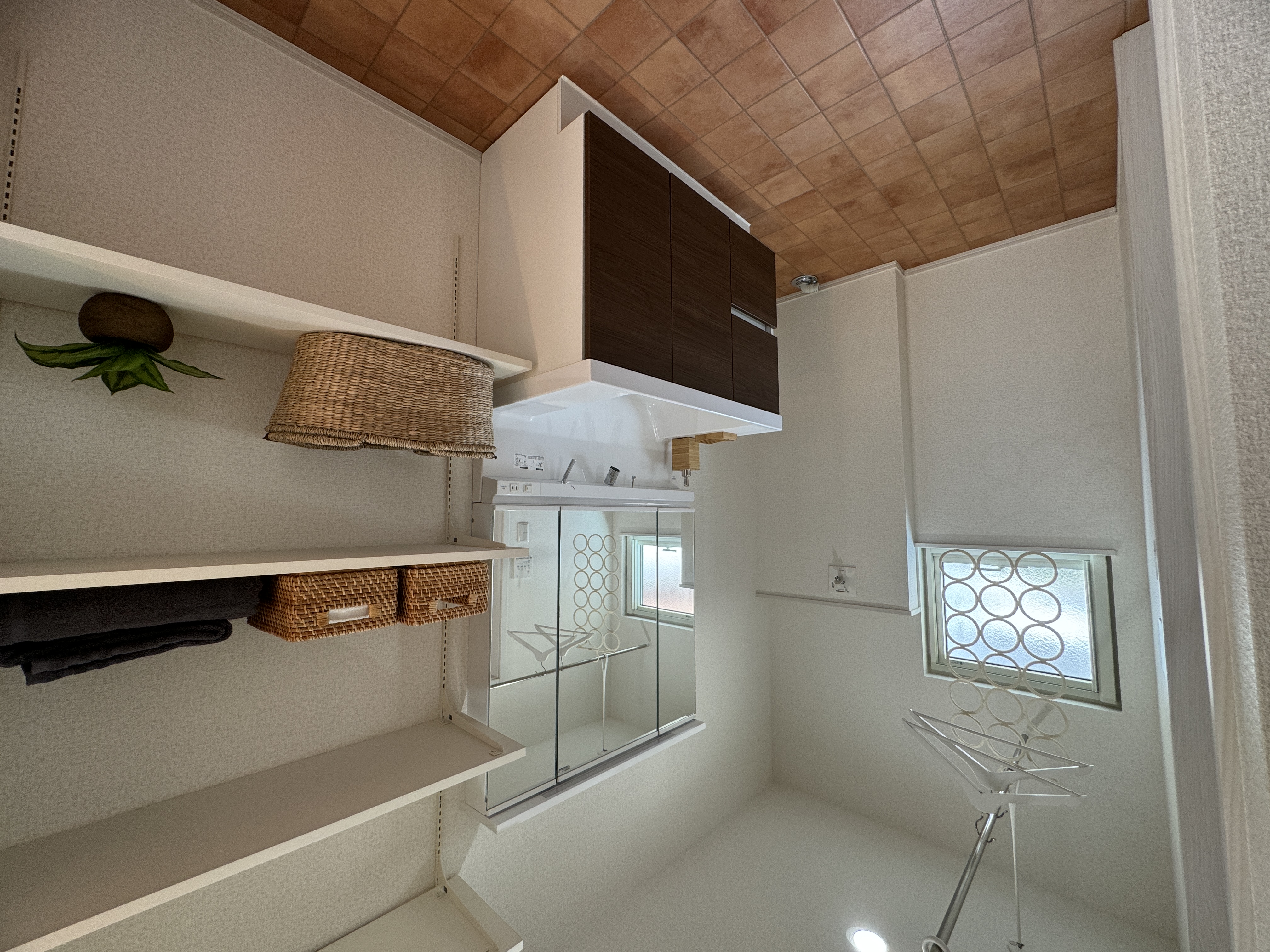 収納たっぷりの洗面脱衣室。 洗面用具やタオルなどを収納できる棚付き!取り外しできるランドリーポールも付いており、 洗濯機からそのまま洗濯物を干すことも可能です。