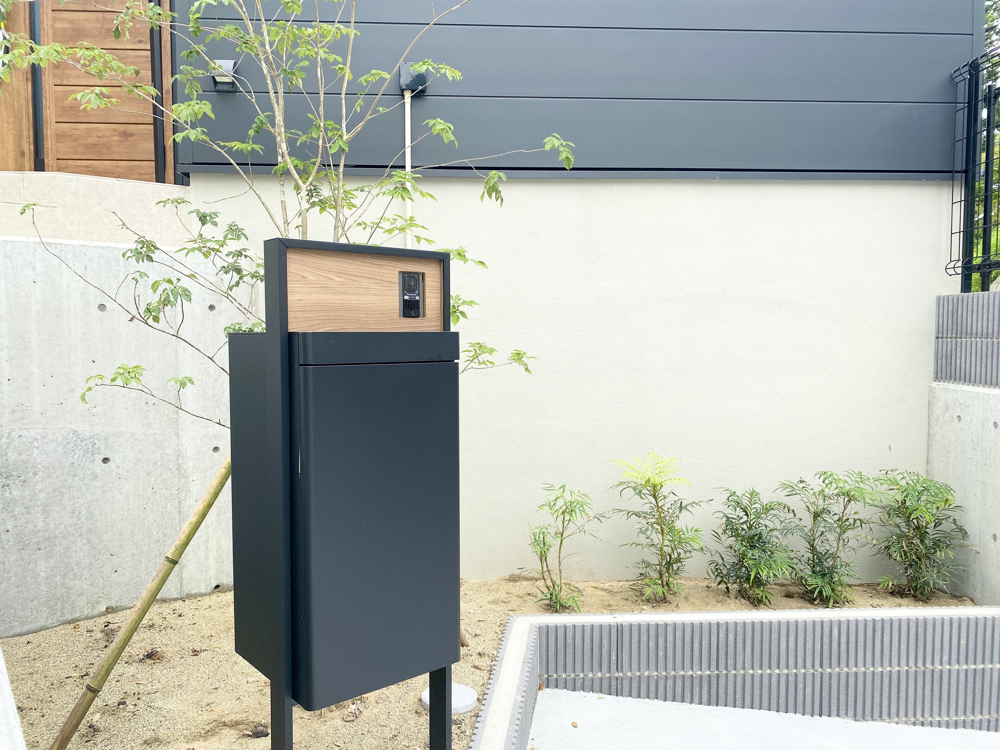 建物の外観に合わせてコーディネートした、ユニテハウスこだわりの外構も工事完了済! 宅配ボックスも付いて不在時の配達も安心。