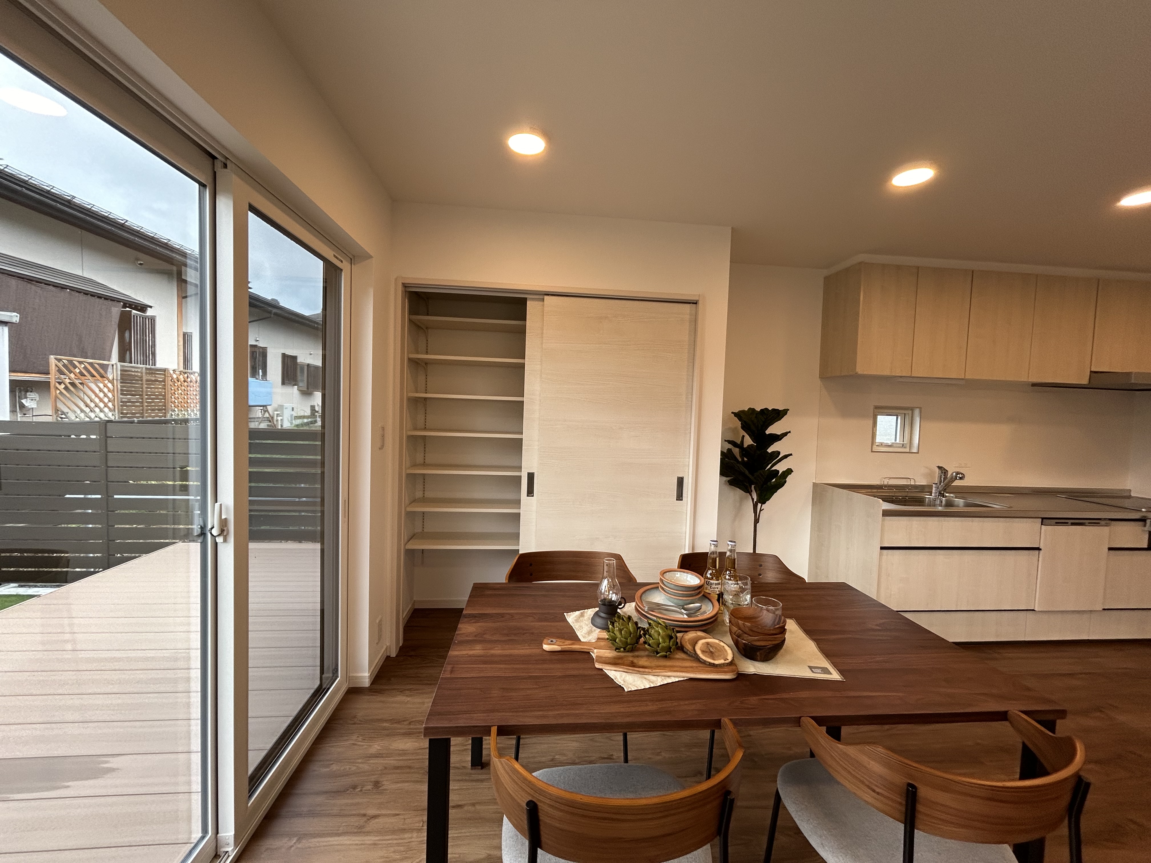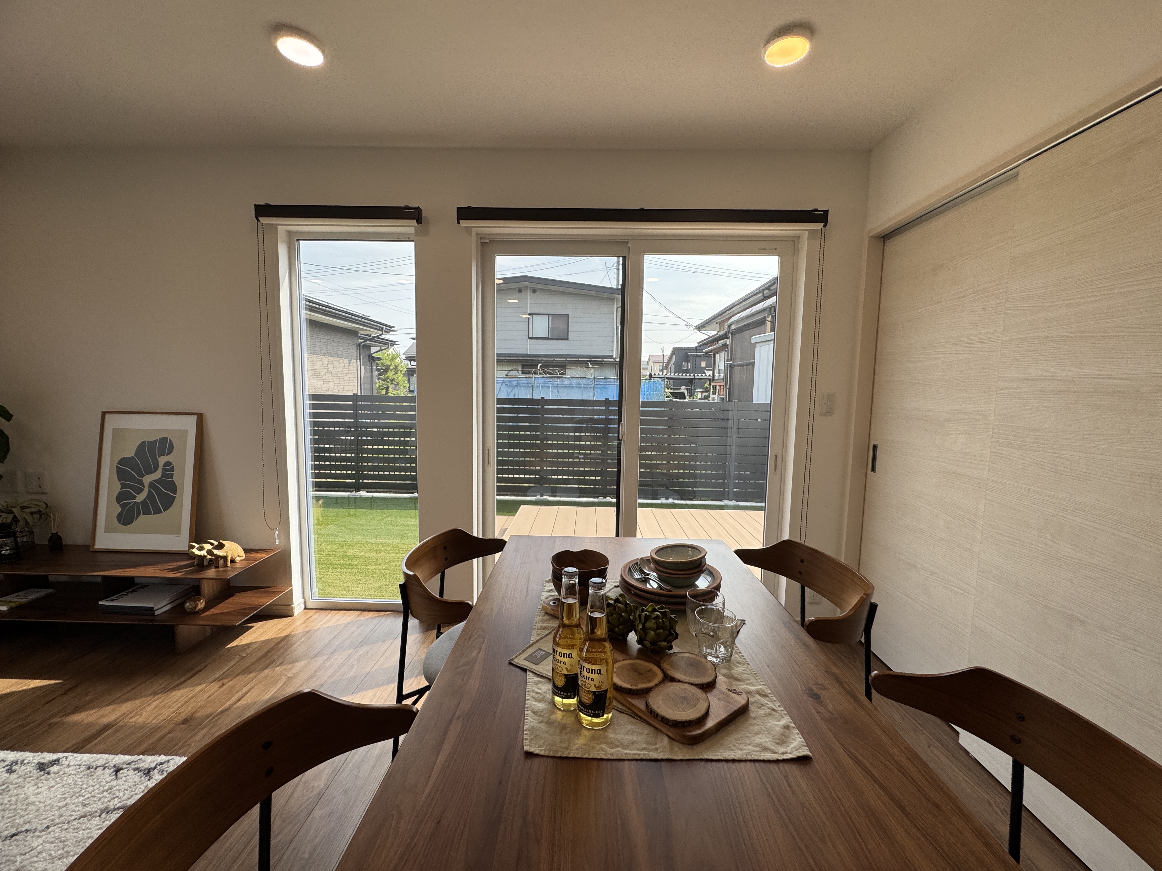 ダイニングの先にはアウトドアリビングを設置。開放感があり、広く見える効果も。 南側に設置した窓からたっぷりと光を取り込みます。