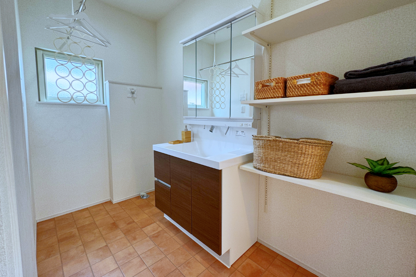 収納たっぷりの洗面脱衣室。 洗面用具やタオルなどを収納できる棚付き!取り外しできるランドリーポールも付いており、 洗濯機からそのまま洗濯物を干すことも可能です。