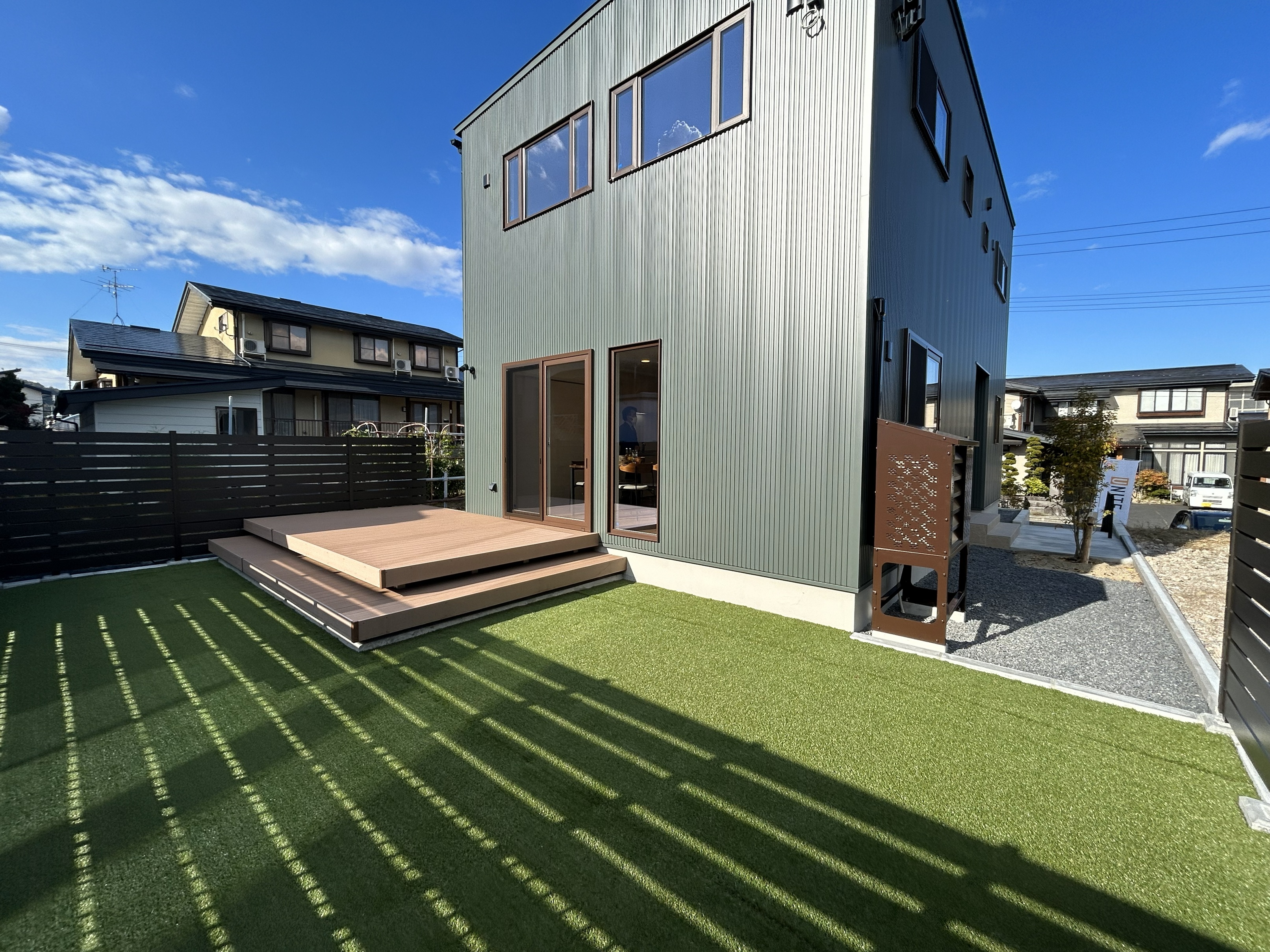 LDKから繋がる人工芝&人工木材デッキはアウトドアリビングとして、外の風を感じながら過ごす空間に。 BBQや水遊びも楽しめる広さです!